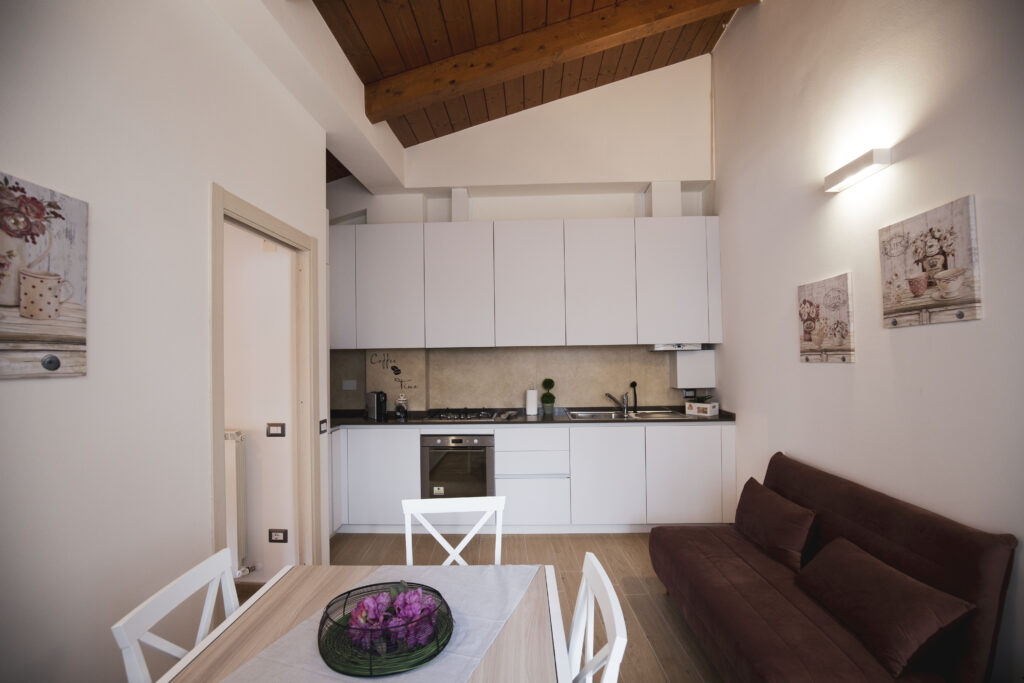 La cucina-soggiorno è attrezzata con tutto ciò di cui si ha bisogno per preparare deliziose cene o semplicemente godersi un caffè al mattino.